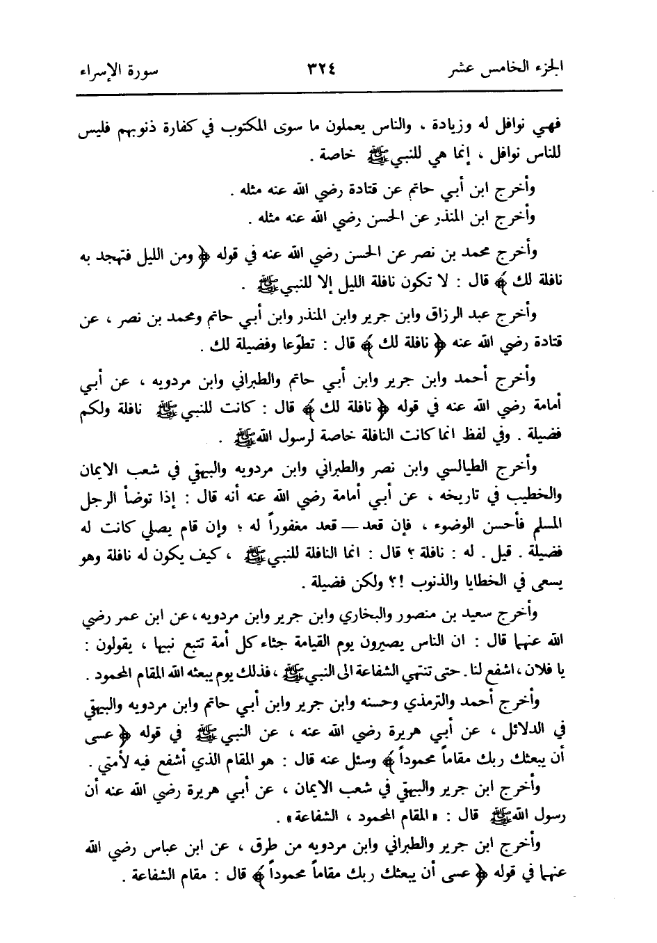 وَأخرج أَحْمد وَابْن جرير وَابْن أبي حَاتِم وَالطَّبَرَانِيّ وَابْن مرْدَوَيْه عَن أبي أُمَامَة رَضِي الله عَنهُ فِي قَوْله: {نَافِلَة لَك} قَالَ: كَانَت للنَّبِي صلى الله عَلَيْهِ وَسلم نَافِلَة وَلكم فَضِيلَة