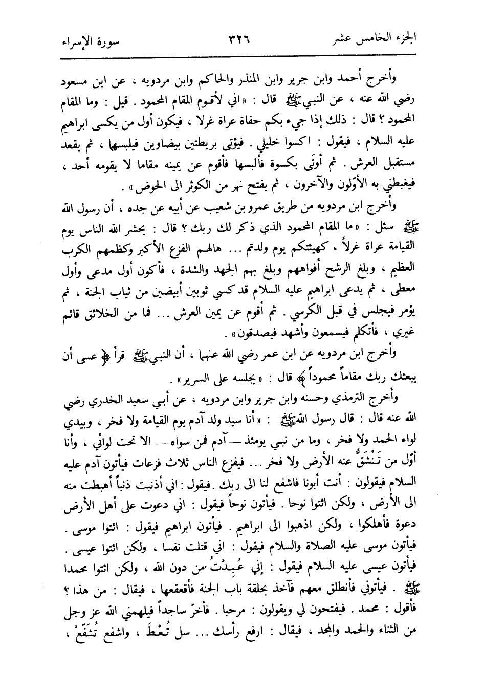 وَأخرج أَحْمد وَابْن جرير وَابْن الْمُنْذر وَالْحَاكِم وَابْن مرْدَوَيْه عَن ابْن مَسْعُود رَضِي الله عَنهُ عَن النَّبِي صلى الله عَلَيْهِ وَسلم قَالَ: إِنِّي لأَقوم الْمقَام الْمَحْمُود