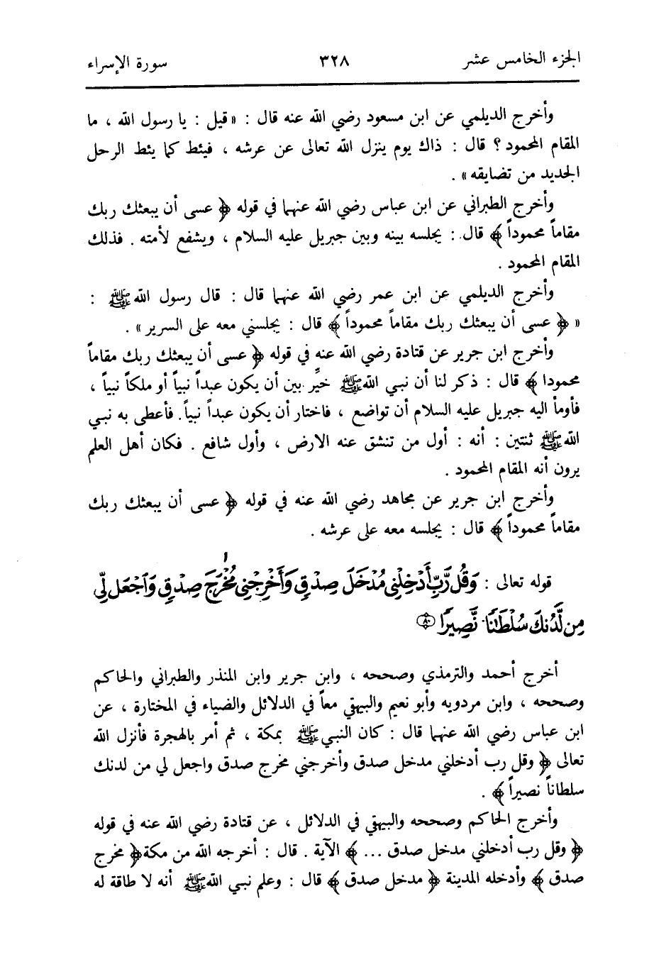 أخرج الطَّبَرَانِيّ عَن ابْن عَبَّاس رَضِي اله عَنْهُمَا فِي قَوْله: {عَسى أَن يَبْعَثك رَبك مقَاما مَحْمُودًا} قَالَ: يجلسه بَينه وَبَين جِبْرِيل عَلَيْهِ السَّلَام ويشفع لأمته
