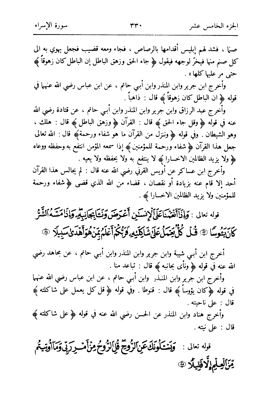 وَأخرج عبد الرَّزَّاق وَابْن جرير وَابْن الْمُنْذر وَابْن أبي حَاتِم عَن قَتَادَة رَضِي الله عَنهُ فِي قَوْله {وَقل جَاءَ الْحق} قَالَ: الْقُرْآن {وزهق الْبَاطِل} قَالَ: هلك وَهُوَ الشَّيْطَان
