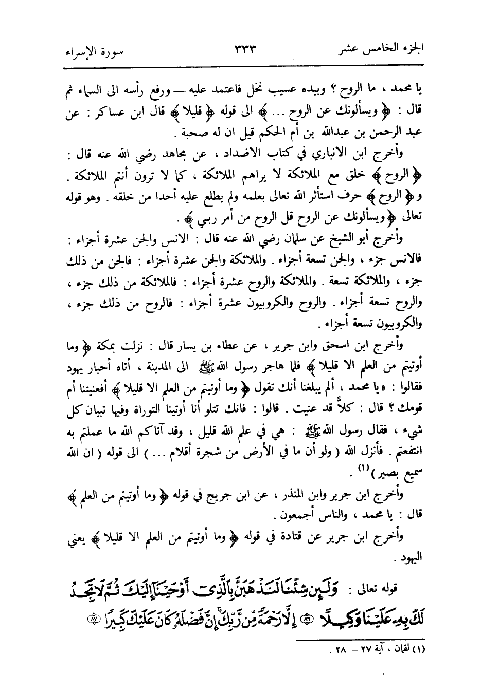 وَأخرج ابْن إِسْحَق وَابْن جرير عَن عَطاء بن يسَار قَالَ: نزلت بِمَكَّة {وَمَا أُوتِيتُمْ من الْعلم إِلَّا قَلِيلا} فَلَمَّا هَاجر رَسُول الله صلى الله عَلَيْهِ وَسلم صلى الله عَلَيْهِ وَسلم إِلَى الْمَدِينَة أَتَاهُ أَحْبَار الْيَهُود فَقَالُوا: يَا مُحَمَّد ألم يبلغنَا أَنَّك تَقول: {وَمَا أُوتِيتُمْ من الْعلم إِلَّا قَلِيلا} أفعنيتنا أم قَوْمك قَالَ: كلاًّ قد عنيت