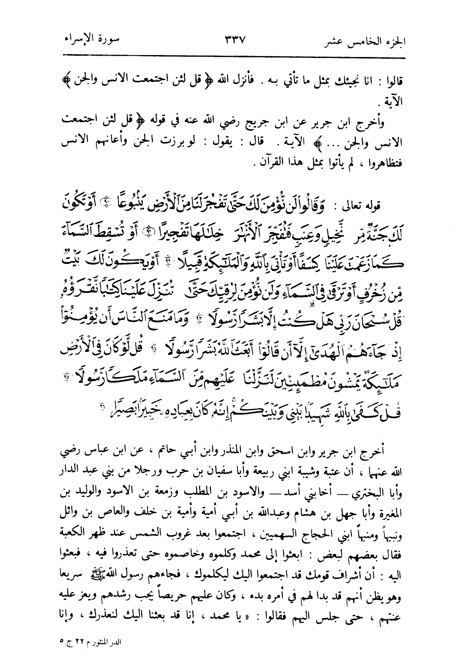 وَأخرج ابْن جرير عَن ابْن جريج رَضِي الله عَنهُ فِي قَوْله: {قل لَئِن اجْتمعت الْإِنْس وَالْجِنّ} الْآيَة
