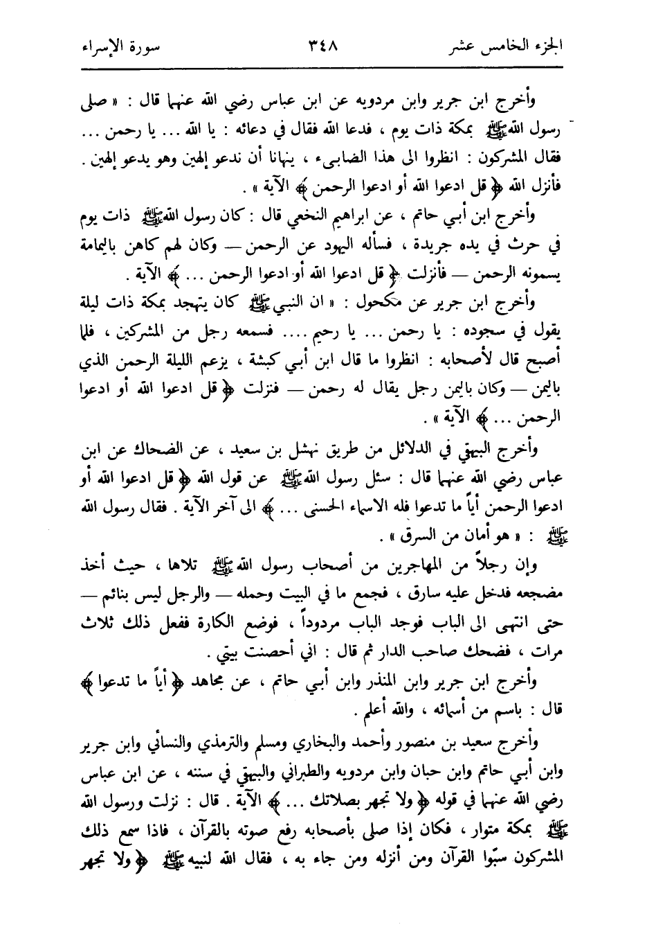 وَأخرج سعيد بن مَنْصُور وَأحمد وَالْبُخَارِيّ وَمُسلم وَالتِّرْمِذِيّ وَالنَّسَائِيّ وَابْن جرير وَابْن أبي حَاتِم وَابْن حبَان وَابْن مرْدَوَيْه وَالطَّبَرَانِيّ وَالْبَيْهَقِيّ فِي سنَنه عَن ابْن عَبَّاس رَضِي الله عَنْهُمَا فِي قَوْله: {وَلَا تجْهر بصلاتك} الْآيَة