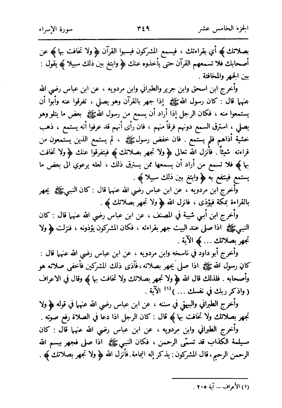 وَأخرج الطَّبَرَانِيّ وَالْبَيْهَقِيّ فِي سنَنه عَن ابْن عَبَّاس رَضِي الله عَنْهُمَا فِي قَوْله: {وَلَا تجْهر بصلاتك وَلَا تخَافت بهَا} قَالَ: كَانَ الرجل إِذا دَعَا فِي الصَّلَاة رفع صَوته