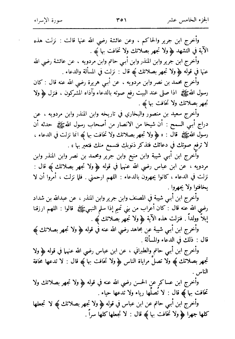 وَأخرج ابْن جرير وَابْن الْمُنْذر وَابْن أبي حَاتِم وَابْن مرْدَوَيْه عَن عَائِشَة رَضِي الله عَنْهَا فِي قَوْله: {وَلَا تجْهر بصلاتك} قَالَ: نزلت فِي الْمَسْأَلَة وَالدُّعَاء