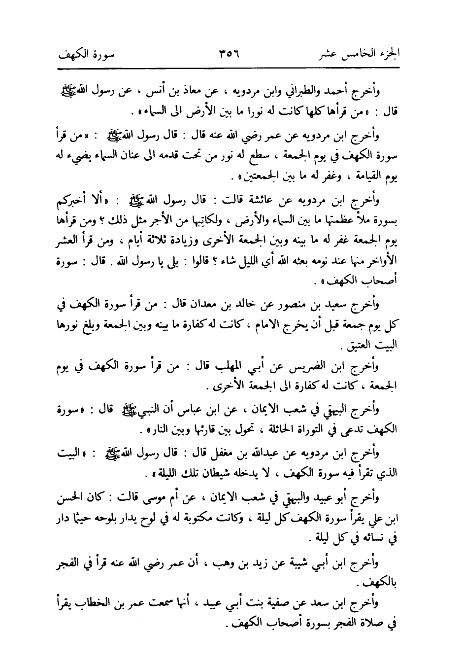 وَأخرج ابْن مرْدَوَيْه عَن عمر رَضِي الله عَنهُ قَالَ: قَالَ رَسُول الله صلى الله عَلَيْهِ وَسلم: من قَرَأَ سُورَة الْكَهْف فِي يَوْم الْجُمُعَة سَطَعَ لَهُ نور من تَحت قدمه إِلَى عنان السَّمَاء يضيء لَهُ يَوْم الْقِيَامَة وَغفر لَهُ مَا بَين الجمعتين
