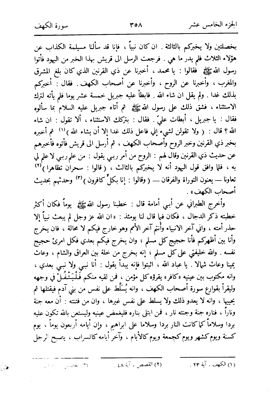 فَقَالَ: بتركك الِاسْتِثْنَاء أَلا تَقول: إِن شَاءَ الله قَالَ: (وَلَا تقولن لشَيْء إِنِّي فَاعل ذَلِك غَدا إِلَّا أَن يَشَاء الله) (الْكَهْف آيَة 23) ثمَّ أخبرهُ عَن حَدِيث ذِي القرنين وَخبر الرّوح وَأَصْحَاب الْكَهْف ثمَّ أرسل إِلَى قُرَيْش فَأتوهُ فَأخْبرهُم عَن حَدِيث ذِي القرنين وَقَالَ لَهُم: الرّوح من أَمر رَبِّي يَقُول: من علم رَبِّي لَا علم لي بِهِ فَلَمَّا وَافق قَول الْيَهُود أَنه لَا يُخْبِركُمْ بالثالث (قَالُوا: سحران تظاهرا) (الْقَصَص آيَة 48) تعاونا - يَعْنِي التَّوْرَاة وَالْفرْقَان - (وَقَالُوا: إِنَّا بِكُل كافرون) (الْقَصَص آيَة 48) وَحَدَّثَهُمْ بِحَدِيث أَصْحَاب الْكَهْف