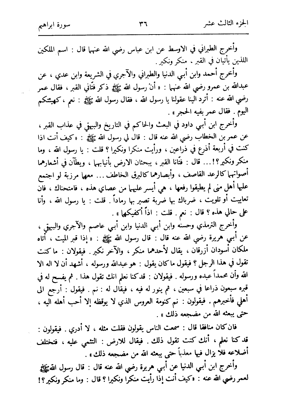 وَأخرج ابْن أبي دَاوُد فِي الْبَعْث وَالْحَاكِم فِي التَّارِيخ وَالْبَيْهَقِيّ فِي عَذَاب الْقَبْر عَن عمر بن الْخطاب رَضِي الله عَنهُ قَالَ: قَالَ لي رَسُول الله صلى الله عَلَيْهِ وَسلم: كَيفَ أَنْت إِذا كنت فِي أَرْبَعَة أَذْرع فِي ذراعين وَرَأَيْت مُنكر وَنَكِير قلت: يَا رَسُول الله وَمَا مُنكر وَنَكِير