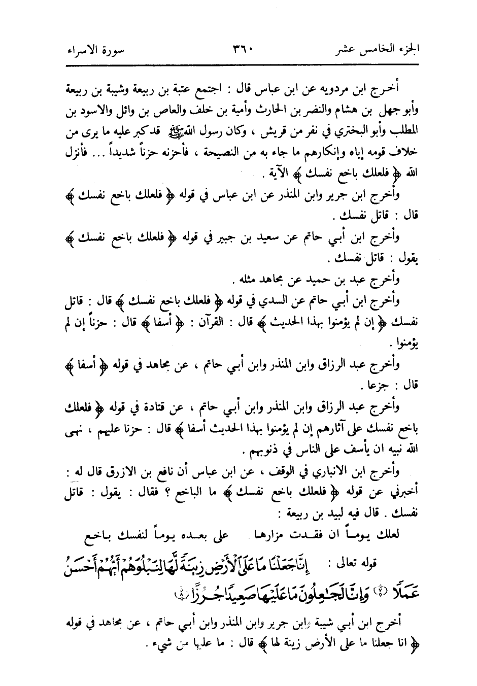وَأخرج ابْن جرير وَابْن الْمُنْذر عَن ابْن عَبَّاس فِي قَوْله: {فلعلك باخع نَفسك} قَالَ: قَاتل نَفسك