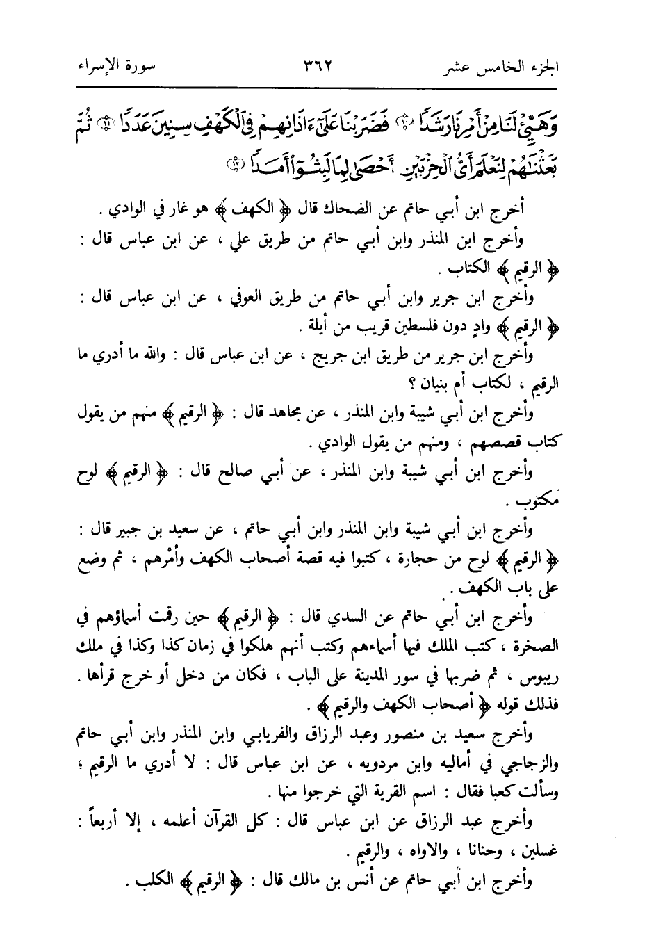 وَأخرج ابْن جرير من طَرِيق ابْن جريج عَن ابْن عَبَّاس قَالَ: وَالله مَا أَدْرِي مَا الرقيم لكتاب أم بُنيان وَأخرج ابْن أبي شيبَة وَابْن الْمُنْذر عَن مُجَاهِد قَالَ: {والرقيم} مِنْهُم من يَقُول كتاب قصصهم وَمِنْهُم من يَقُول الْوَادي