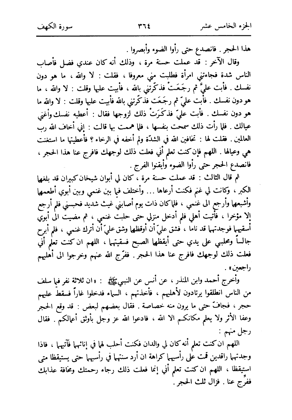 وَأخرج أَحْمد وَابْن الْمُنْذر عَن أنس عَن النَّبِي صلى الله عَلَيْهِ وَسلم: أَن ثَلَاثَة نفر فِيمَا سلف من النَّاس انْطَلقُوا يرتادون لأهليهم فَأَخَذتهم السَّمَاء فَدَخَلُوا غاراً فَسقط عَلَيْهِم حجر فجافّ حَتَّى مَا يرَوْنَ مِنْهُ خصَاصَة