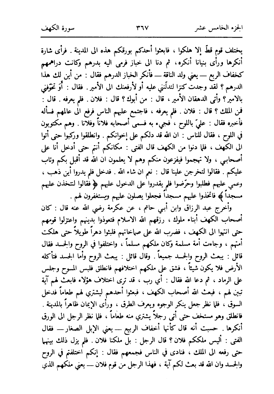 وَأخرج عبد الرَّزَّاق وَابْن أبي حَاتِم عَن عِكْرِمَة رَضِي الله عَنهُ قَالَ: كَانَ أَصْحَاب الْكَهْف أَبنَاء مُلُوك رزقهم الله الْإِسْلَام فتعوذوا بدينهم واعتزلوا قَومهمْ حَتَّى انْتَهوا إِلَى الْكَهْف فَضرب الله على صماخاتهم فلبثوا دهراً طَويلا حَتَّى هَلَكت أمتهم وَجَاءَت أمة مسلمة وَكَانَ ملكهم مُسلما وَاخْتلفُوا فِي الرّوح والجسد فَقَالَ قَائِل: يبْعَث الرّوح والجسد جَمِيعًا