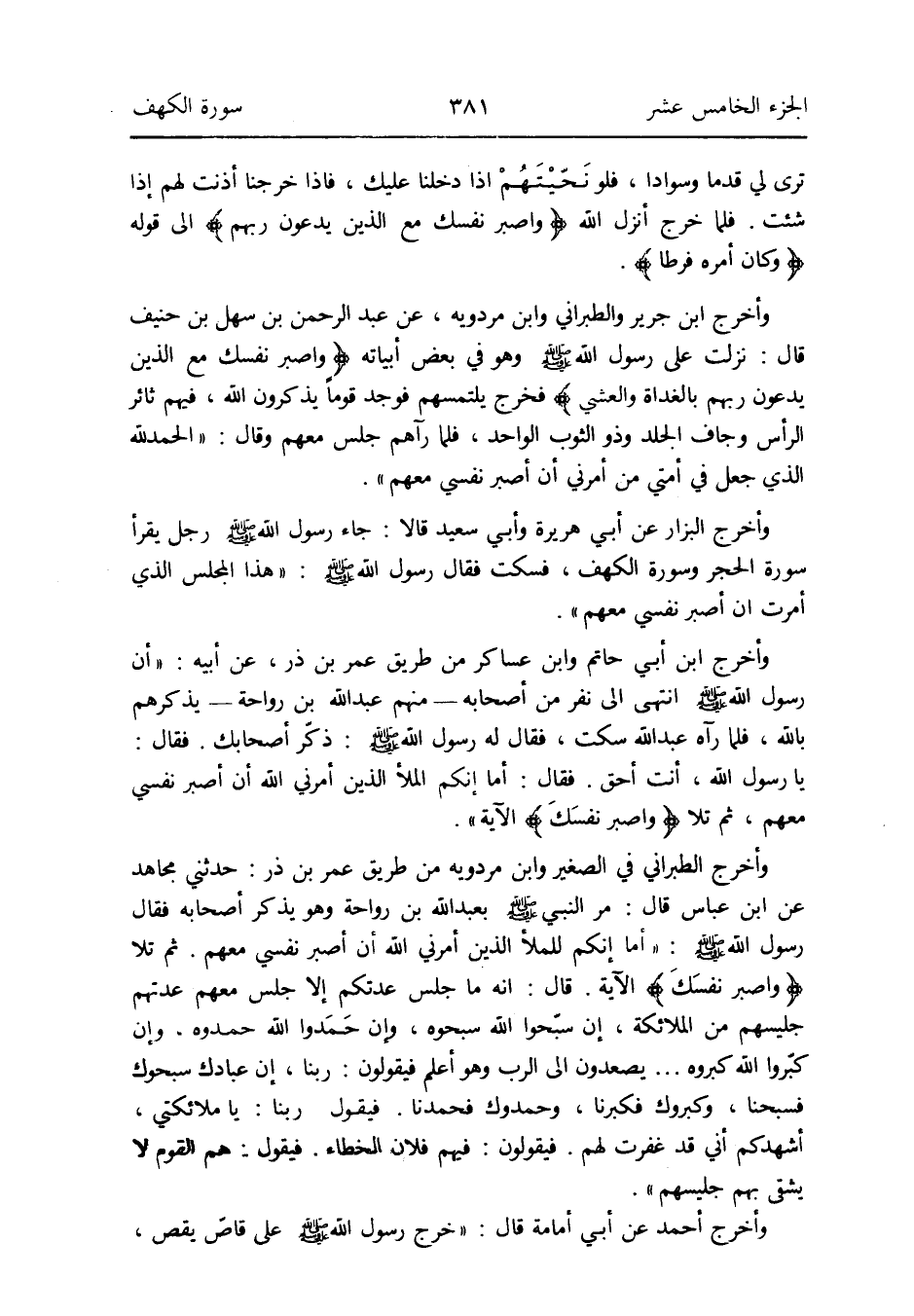 وَأخرج ابْن جرير وَالطَّبَرَانِيّ وَابْن مرْدَوَيْه عَن عبد الرَّحْمَن بن سهل بن حنيف قَالَ: نزلت على رَسُول الله صلى الله عَلَيْهِ وَسلم وَهُوَ فِي بعض أبياته {واصبر نَفسك مَعَ الَّذين يدعونَ رَبهم بِالْغَدَاةِ والعشي} فَخرج يلتمسهم فَوجدَ قوما يذكرُونَ الله فيهم ثَائِر الرَّأْس وجاف الْجلد وَذُو الثَّوْب الْوَاحِد فَلَمَّا رَآهُمْ جلس مَعَهم وَقَالَ: الْحَمد لله الَّذِي جعل فِي أمتِي من أَمْرِي أَن أَصْبِر نَفسِي مَعَهم
