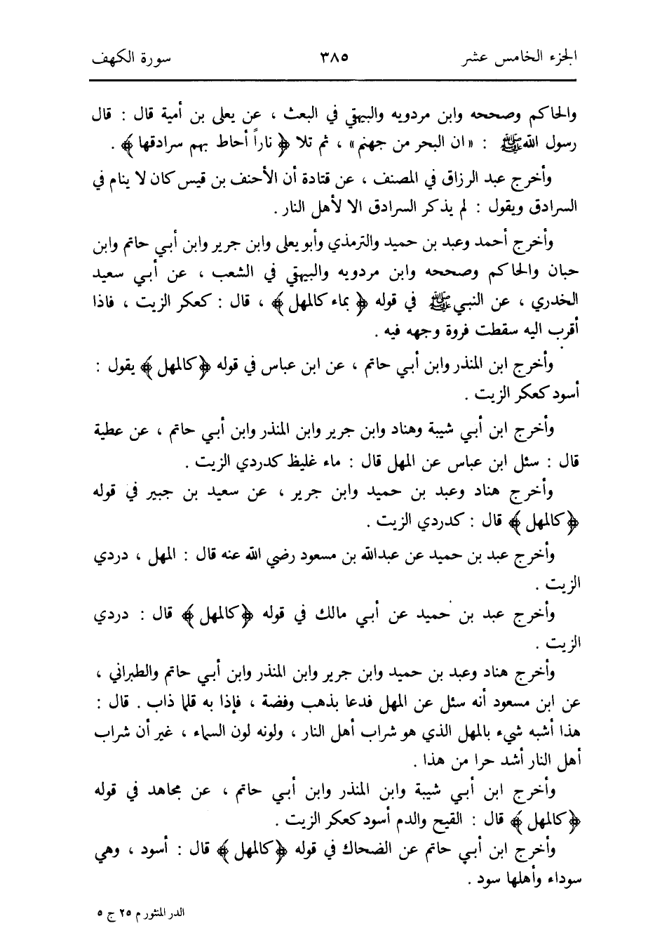 وَأخرج أَحْمد وَعبد بن حميد وَالتِّرْمِذِيّ وَأَبُو يعلى وَابْن جرير وَابْن أبي حَاتِم وَابْن حبَان وَالْحَاكِم وَصَححهُ وَابْن مرْدَوَيْه وَالْبَيْهَقِيّ فِي الشّعب عَن أبي سعيد الْخُدْرِيّ عَن النَّبِي صلى الله عَلَيْهِ وَسلم فِي قَوْله: {بِمَاء كَالْمهْلِ} قَالَ: كَعَكرِ الزَّيْت فَإِذا أقرب إِلَيْهِ سَقَطت فَرْوَة وَجهه فِيهِ