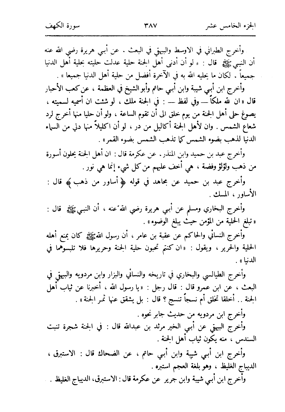 وَأخرج عبد بن حميد وَابْن الْمُنْذر عَن عِكْرِمَة قَالَ: إِن أهل الْجنَّة يحلونَ أسورة من ذهب ولؤلؤ وَفِضة هِيَ أخف عَلَيْهِم من كل شَيْء إِنَّمَا هِيَ نور