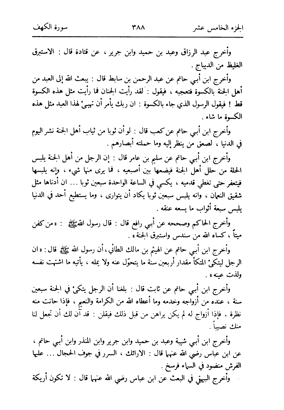 وَأخرج ابْن أبي حَاتِم عَن عبد الرَّحْمَن بن سابط قَالَ: يبْعَث الله إِلَى العَبْد من أهل الْجنَّة بالكسوة فتعجبه فَيَقُول: لقد رَأَيْت الْجنان فَمَا رَأَيْت مثل هَذِه الْكسْوَة قطّ فَيَقُول الرَّسُول الَّذِي جَاءَ بالكسوة: إِن رَبك يَأْمر أَن تهيئ لهَذَا العَبْد مثل هَذِه الْكسْوَة مَا شَاءَ