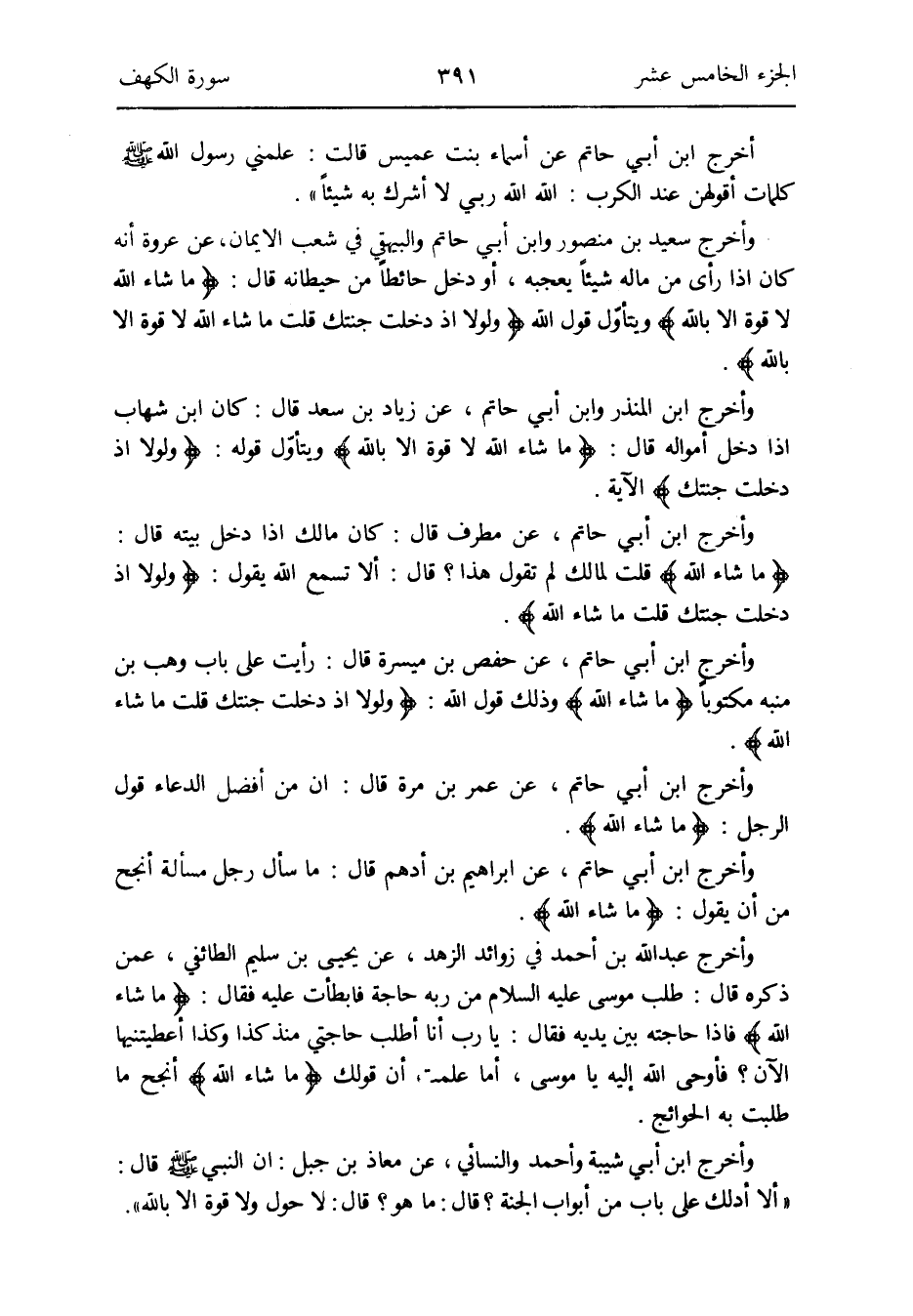 وَأخرج ابْن الْمُنْذر وَابْن أبي حَاتِم عَن زِيَاد بن سعد قَالَ: كَانَ ابْن شهَاب إِذا دخل أَمْوَاله قَالَ: {مَا شَاءَ الله لَا قُوَّة إِلَّا بِاللَّه} ويتأول قَوْله: {وَلَوْلَا إِذْ دخلت جنتك} الْآيَة