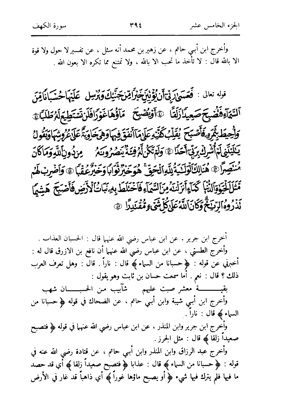 وَأخرج عبد الرَّزَّاق وَابْن الْمُنْذر وَابْن أبي حَاتِم عَن قَتَادَة رَضِي الله عَنهُ فِي قَوْله: {حسباناً من السَّمَاء} قَالَ: عذَابا {فَتُصْبِح صَعِيدا زلقاً} أَي قد حصد مَا فِيهَا فَلم يتْرك فِيهَا شَيْء {أَو يصبح مَاؤُهَا غوراً} أَي ذَاهِبًا قد غَار فِي الأَرْض