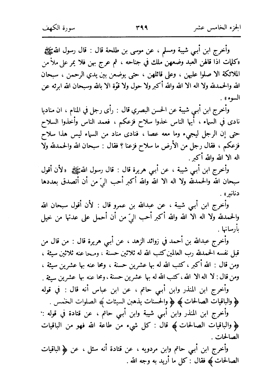 وَأخرج ابْن أبي شيبَة عَن أبي هُرَيْرَة قَالَ: قَالَ رَسُول الله صلى الله عَلَيْهِ وَسلم: لِأَن أَقُول سُبْحَانَ الله وَالْحَمْد لله وَلَا إِلَه إِلَّا الله وَالله أكبر أحب إليّ من أَتصدق بعددها دَنَانِير