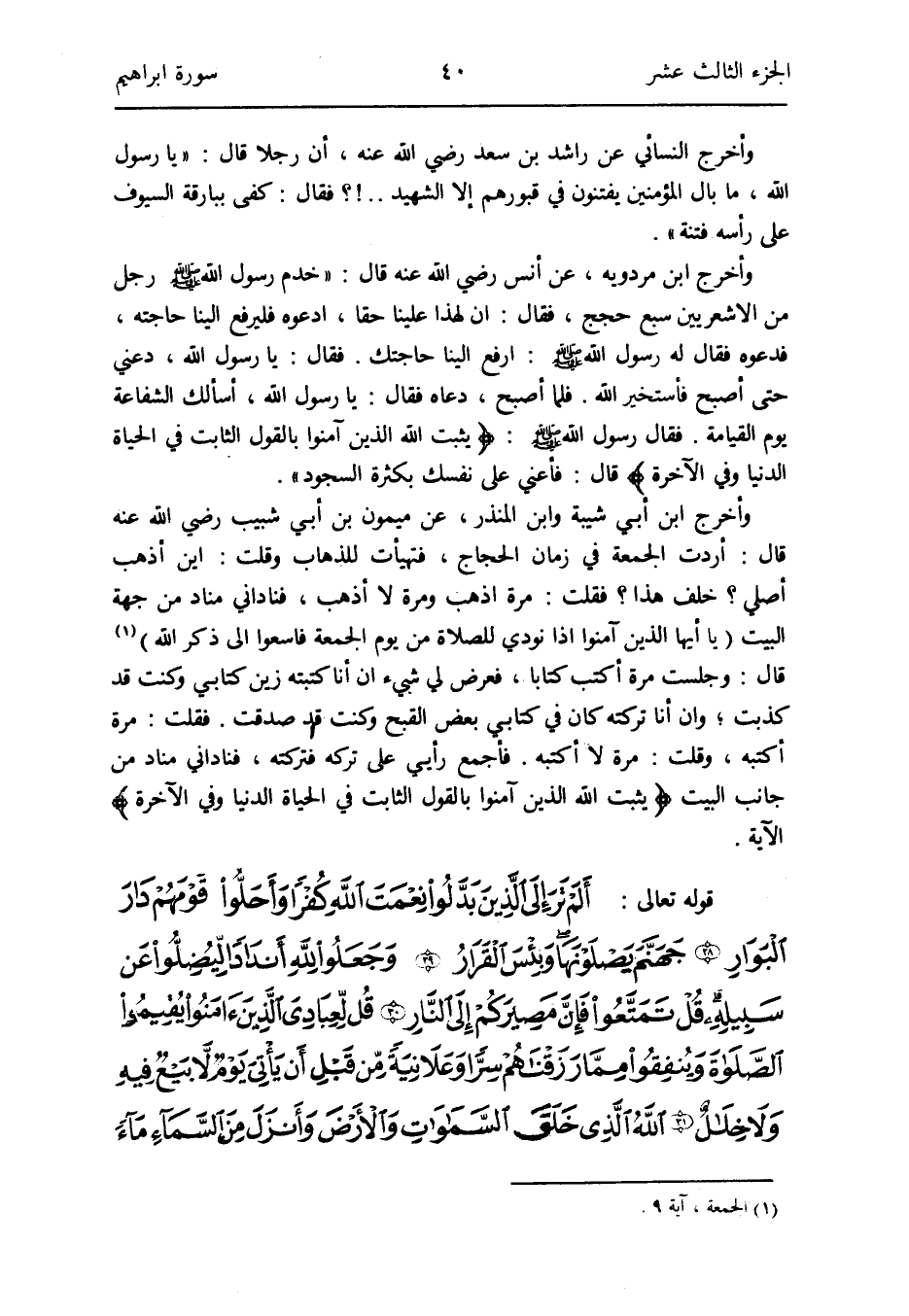 فَقَالَ رَسُول الله صلى الله عَلَيْهِ وَسلم: {يثبت الله الَّذين آمنُوا بالْقَوْل الثَّابِت فِي الْحَيَاة الدُّنْيَا وَفِي الْآخِرَة} قَالَ: فأعني على نَفسك بِكَثْرَة السُّجُود