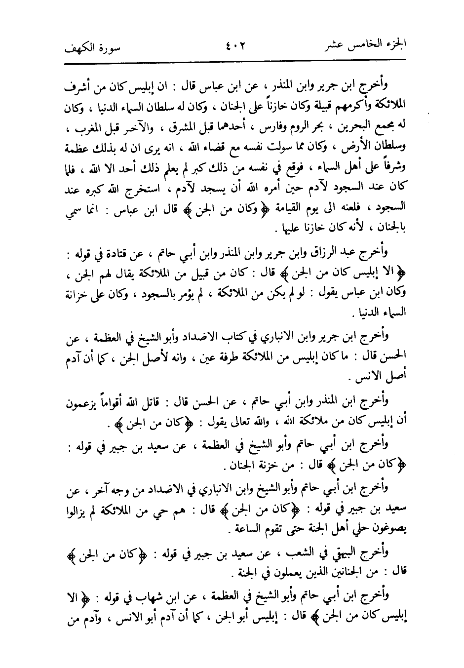 وَأخرج ابْن أبي حَاتِم وَأَبُو الشَّيْخ وَابْن الْأَنْبَارِي فِي الأضداد من وَجه آخر عَن سعيد بن جُبَير فِي قَوْله: {كَانَ من الْجِنّ} قَالَ: هم حَيّ من الْمَلَائِكَة لم يزَالُوا يصوغون حلي أهل الْجنَّة حَتَّى تقوم السَّاعَة
