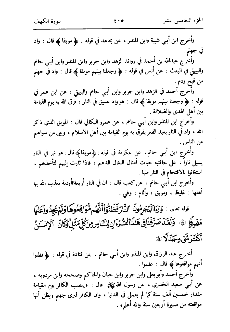 وَأخرج أَحْمد فِي الزّهْد وَابْن جرير وَابْن أبي حَاتِم وَالْبَيْهَقِيّ عَن ابْن عمر فِي قَوْله: {وَجَعَلنَا بَينهم موبقاً} قَالَ: هُوَ وَاد عميق فِي النَّار فرق الله بِهِ يَوْم الْقِيَامَة بَين أهل الْهدى والضلالة