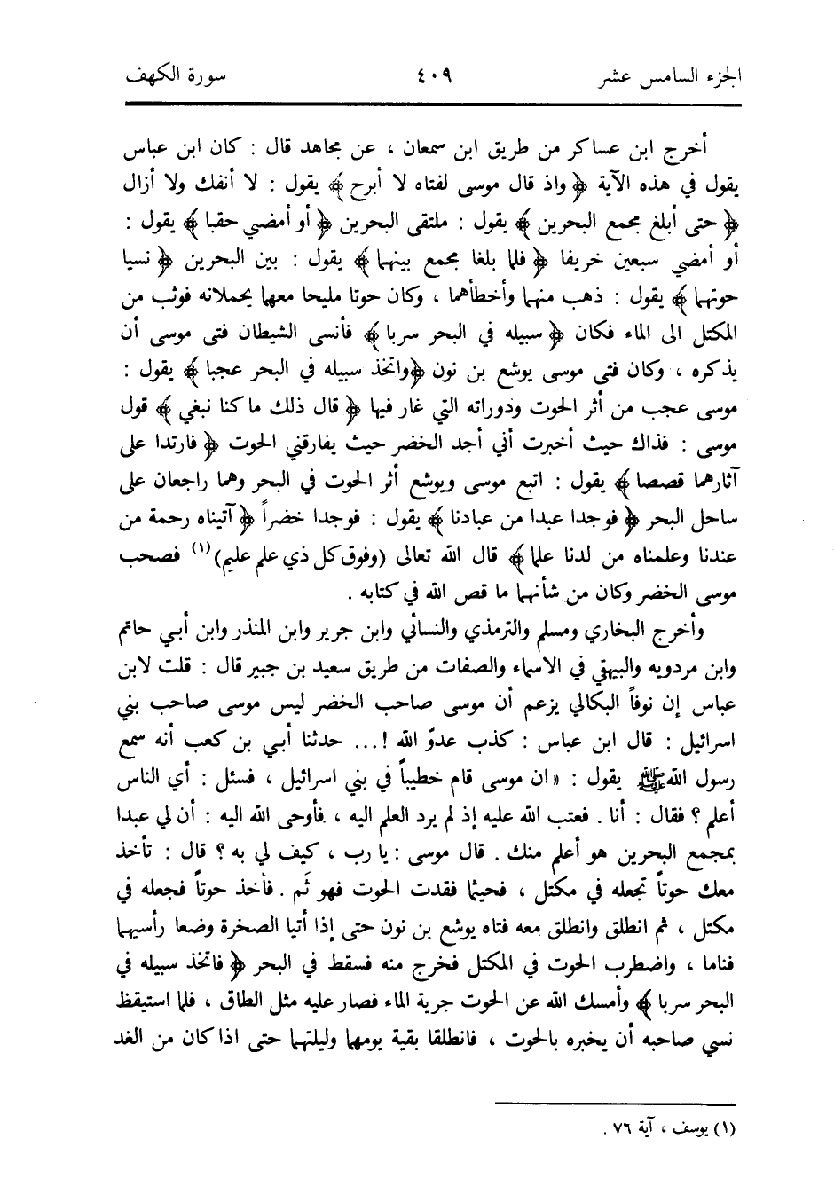 أخرج ابْن عَسَاكِر من طَرِيق ابْن سمْعَان عَن مُجَاهِد قَالَ: كَانَ ابْن عَبَّاس يَقُول فِي هَذِه الْآيَة {وَإِذ قَالَ مُوسَى لفتاه لَا أَبْرَح} يَقُول: لَا أَنْفك وَلَا أَزَال {حَتَّى أبلغ مجمع الْبَحْرين} يَقُول: ملتقى الْبَحْرين {أَو أمضي حقباً} يَقُول: أَو أمضي سبعين خَرِيفًا {فَلَمَّا بلغا مجمع بَينهمَا} يَقُول: بَين الْبَحْرين {نسيا حوتهما} يَقُول: ذهب مِنْهُمَا وأخطأهما وَكَانَ حوتاً مليحاً مَعَهُمَا يحملانه فَوَثَبَ من المكتل إِلَى المَاء فَكَانَ {سَبيله فِي الْبَحْر سرباً} فأنسى الشَّيْطَان فَتى مُوسَى أَن يذكرهُ وَكَانَ فَتى مُوسَى يُوشَع بن نون {وَاتخذ سَبيله فِي الْبَحْر عجبا} يَقُول: مُوسَى عجب من أثر الْحُوت ودوراته الَّتِي غَار فِيهَا {قَالَ ذَلِك مَا كُنَّا نبغ} قَول مُوسَى: فَذَاك حَيْثُ أخْبرت أَنِّي أجد الْخضر حَيْثُ يفارقني الْحُوت {فارتدا على آثارهما قصصاً} يَقُول: اتبع مُوسَى ويوشع أثر الْحُوت فِي الْبَحْر وهم راجعان على سَاحل الْبَحْر {فوجدا عبدا من عبادنَا} يَقُول: فوجدا خضرًا {آتيناه رَحْمَة من عندنَا وعلمناه من لدنا علما} قَالَ الله تَعَالَى: (وَفَوق كل ذِي علم عليم) (يُوسُف آيَة 76) فصحب مُوسَى الْخضر وَكَانَ من شَأْنهمَا مَا قصّ الله فِي كِتَابه