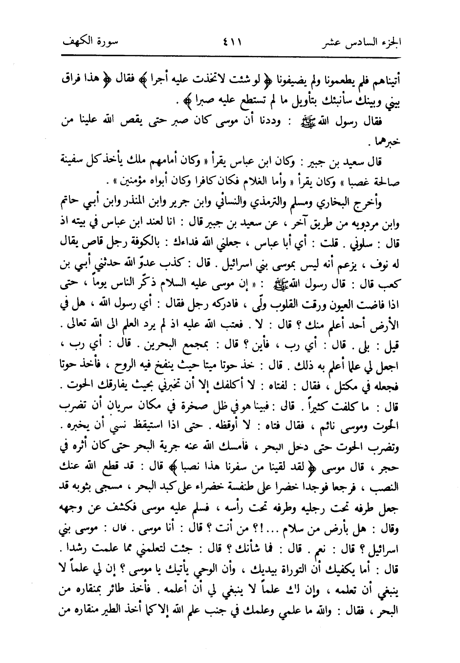 قَالَ مُوسَى {لقد لَقينَا من سفرنا هَذَا نصبا} قَالَ: قد قطع الله عَنْك النصب فَرَجَعَا فوجدا خضرًا على طنفسة خضراء على كبد الْبَحْر مسجى ثَوْبه قد جعل طرفه تَحت رجلَيْهِ وطرفه تَحت رَأسه فَسلم عَلَيْهِ مُوسَى فكسف عَن وَجهه وَقَالَ: هَل بِأَرْض من سَلام