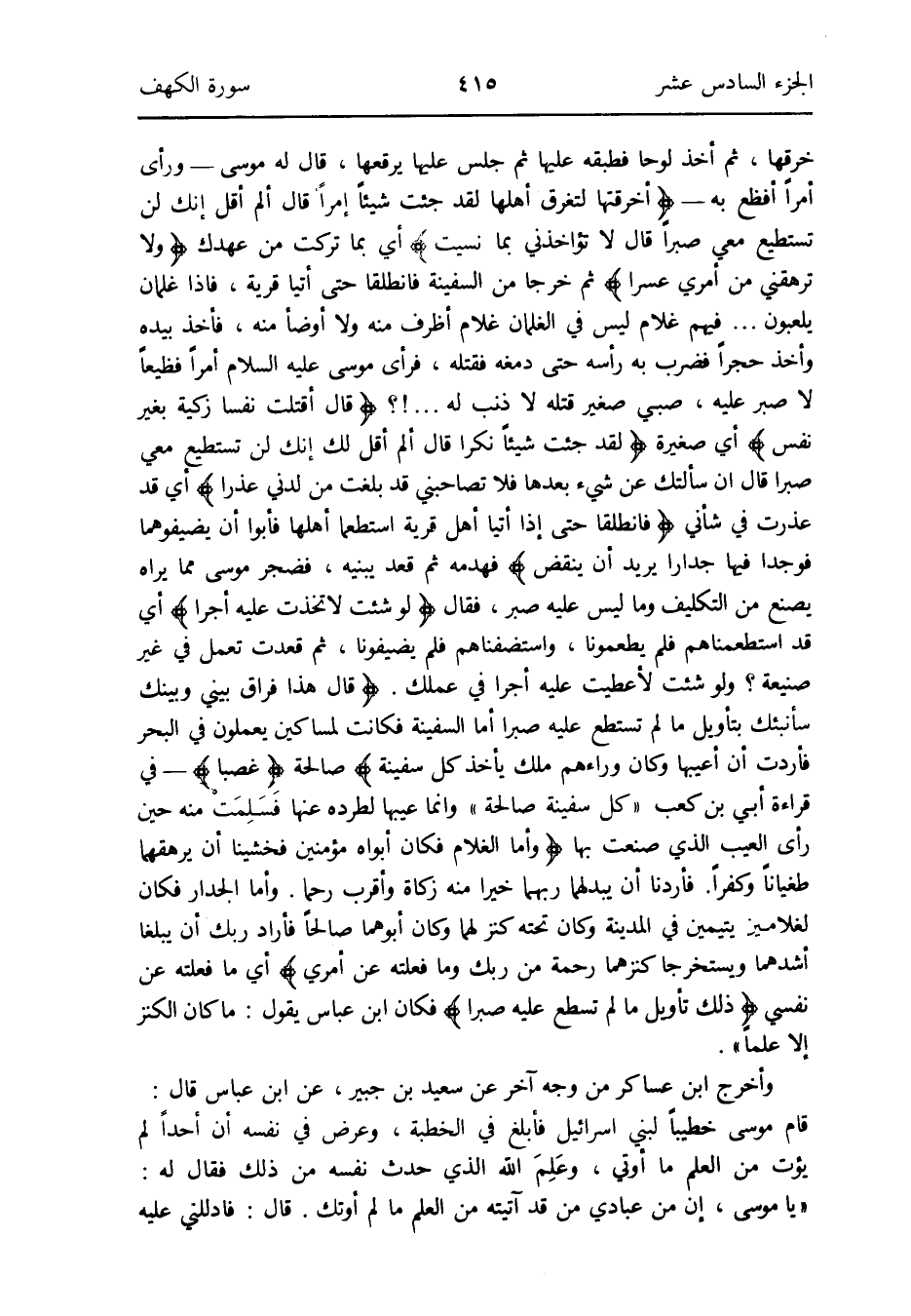 {قَالَ هَذَا فِرَاق بيني وَبَيْنك سأنبئك بِتَأْوِيل مَا لم تستطع عَلَيْهِ صبرا أما السَّفِينَة فَكَانَت لمساكين يعْملُونَ فِي الْبَحْر فَأَرَدْت أَن أعيبها وَكَانَ وَرَاءَهُمْ ملك يَأْخُذ كل سفينة} صَالِحَة {غصبا} - فِي قِرَاءَة أبيّ بن كَعْب كل سفينة صَالِحَة وَإِنَّمَا عيبها لطرده عَنْهَا فَسَلِمَتْ مِنْهُ حِين رأى الْعَيْب الَّذِي صنعت بهَا {وَأما الْغُلَام فَكَانَ أَبَوَاهُ مُؤمنين فَخَشِينَا أَن يرهقهما طغياناً وَكفرا فأردنا أَن يبدلهما ربهما خيرا مِنْهُ زَكَاة وَأقرب رحما وَأما الْجِدَار فَكَانَ لغلامين يتيمين فِي الْمَدِينَة وَكَانَ تَحْتَهُ كنز لَهما وَكَانَ أَبوهُمَا صَالحا فَأَرَادَ رَبك أَن يبلغَا أشدهما ويستخرجا كنزهما رَحْمَة من رَبك وَمَا فعلته عَن أَمْرِي} أَي مَا فعلته عَن نَفسِي {ذَلِك تَأْوِيل مَا لم تسطع عَلَيْهِ صبرا} فَكَانَ ابْن عَبَّاس يَقُول: مَا كَانَ الْكَنْز إِلَّا علما