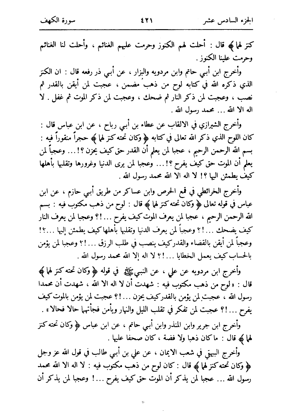 وَأخرج الخرائطي فِي قمع الْحِرْص وَابْن عَسَاكِر من طَرِيق أبي حَازِم عَن ابْن عَبَّاس فِي قَوْله تَعَالَى: {وَكَانَ تَحْتَهُ كنز لَهما} قَالَ: لوح من ذهب مَكْتُوب فِيهِ: بِسم الله الرَّحْمَن الرَّحِيم عجبا لمن يعرف الْمَوْت كَيفَ يفرح