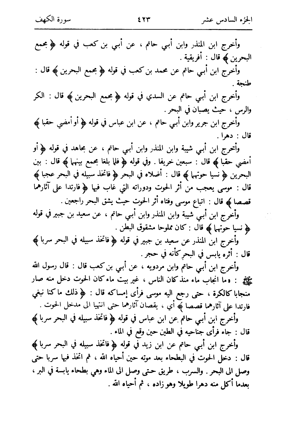 وَأخرج ابْن أبي حَاتِم وَابْن مرْدَوَيْه عَن أبي بن كَعْب قَالَ: قَالَ رَسُول الله صلى الله عَلَيْهِ وَسلم: مَا انجاب مَاء مُنْذُ كَانَ النَّاس غير بَيت مَاء الْحُوت دخل مِنْهُ صَار منجاباً كالكرة حَتَّى رَجَعَ إِلَيْهِ مُوسَى فَرَأى إِمْسَاكه قَالَ: {ذَلِك مَا كُنَّا نبغ فارتدا على آثارهما قصصاً} أَي يقصان آثارهما حَتَّى انتهيا إِلَى مدْخل الْبَحْر
