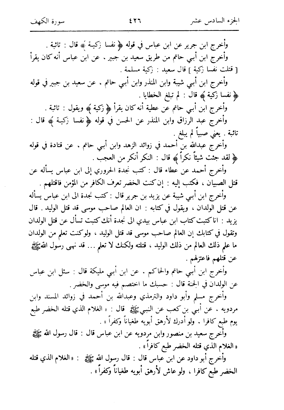 وَأخرج ابْن أبي حَاتِم من طَرِيق سعيد بن جُبَير عَن ابْن عَبَّاس أَنه كَانَ يقْرَأ [قتلت نفسا زكية] قَالَ سعيد: زكية مسلمة