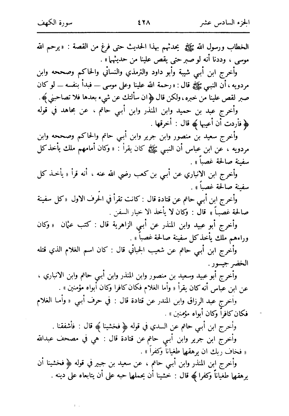 وَأخرج ابْن الْمُنْذر وَابْن أبي حَاتِم عَن سعيد بن جُبَير فِي قَوْله: {فَخَشِينَا أَن يرهقهما طغياناً وَكفرا} قَالَ: خشينا أَن يحملهما حبه على أَن يتابعاه على دينه