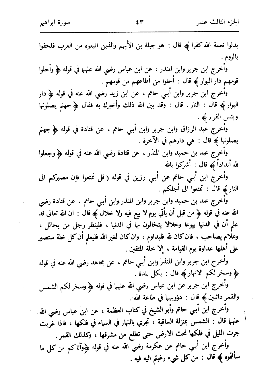 وَأخرج ابْن جرير عَن ابْن عَبَّاس رَضِي الله عَنْهُمَا فِي قَوْله: {وسخر لكم الشَّمْس وَالْقَمَر دائبين} قَالَ: دؤوبهما فِي طَاعَة الله