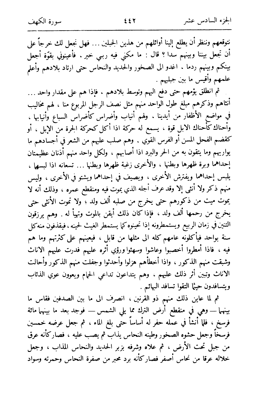 ثمَّ لما عاين ذَلِك مِنْهُم ذُو القرنين انْصَرف إِلَى مَا بَين الصدفين فقاس مَا بَينهمَا - وَهِي فِي مُنْقَطع أَرض التّرْك مِمَّا يَلِي الشَّمْس - فَوجدَ بعد مَا بَينهمَا مائَة فَرسَخ فَلَمَّا أنشأ فِي عمله حفر لَهُ أساساً حَتَّى بلغ المَاء ثمَّ جعل عرضه خمسين فرسخاً وَجعل حشوه الصخور وطينه النّحاس يذاب ثمَّ يصب عَلَيْهِ فَصَارَ كَأَنَّهُ عرق من جبل تَحت الأَرْض ثمَّ علا وشرفه بزبر الْحَدِيد والنحاس الْمُذَاب وَجعل خلاله عرقاً من نُحَاس أصفر فَصَارَ كَأَنَّهُ محبر من صفرَة النّحاس وحمرته وَسَوَاد