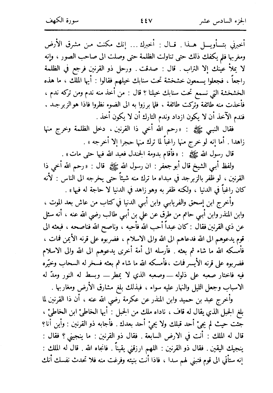 وَلَفظ أبي الشَّيْخ: قَالَ أَبُو جَعْفَر: أَن رَسُول الله صلى الله عَلَيْهِ وَسلم قَالَ: رحم الله أخي ذَا القرنين لَو ظفر بالزبرجد فِي مبداه مَا ترك مِنْهُ شَيْئا حَتَّى يُخرجهُ إِلَى النَّاس لِأَنَّهُ كَانَ رَاغِبًا فِي الدُّنْيَا وَلكنه ظفر بِهِ وَهُوَ زاهد فِي الدُّنْيَا لَا حَاجَة لَهُ فِيهَا