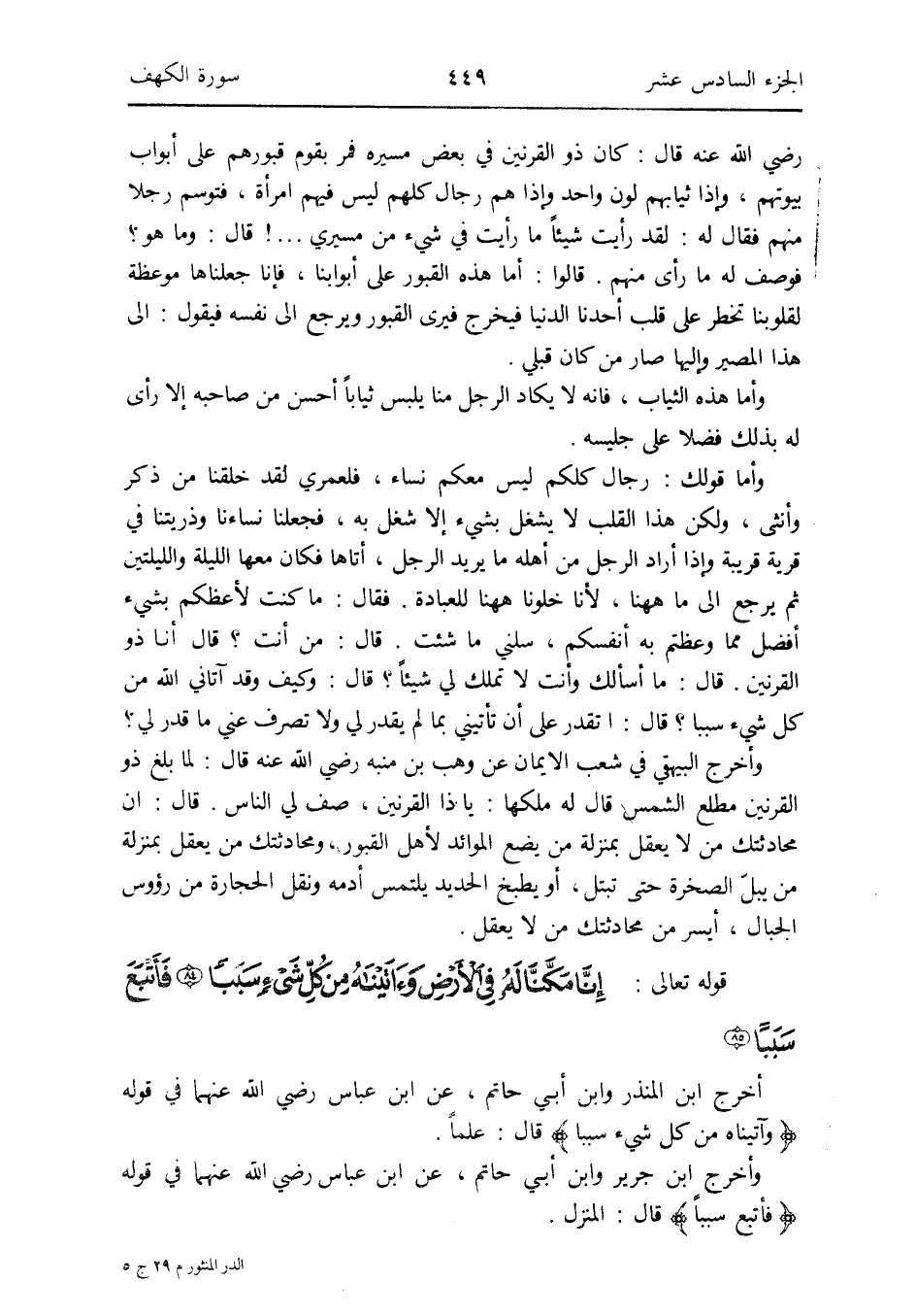 قَالَ: مَا أَسأَلك وَأَنت لَا تملك لي شَيْئا قَالَ: وَكَيف وَقد آتَانِي الله من كل شَيْء سَببا قَالَ: أتقدر على أَن تَأتِينِي بِمَا لم يقدر لي وَلَا تصرف عني مَا قدر لي وَأخرج الْبَيْهَقِيّ فِي شعب الإِيمان عَن وهب بن مُنَبّه رَضِي الله عَنهُ قَالَ: لما بلغ ذُو القرنين مطلع الشَّمْس قَالَ لَهُ ملكهَا: يَا ذَا القرنين صف لي النَّاس