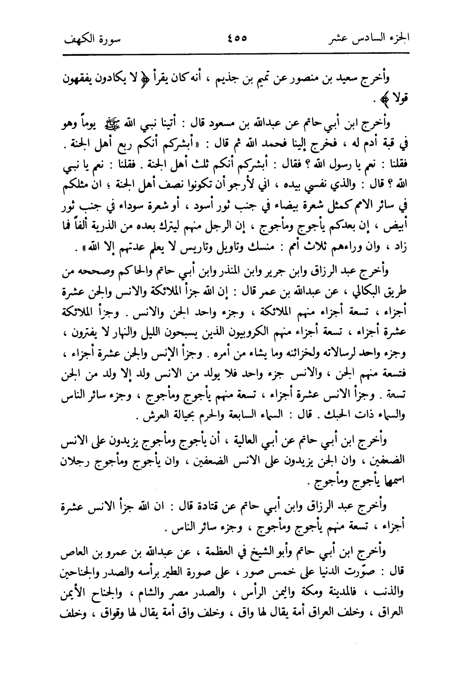 وَأخرج عبد الرَّزَّاق ابْن أبي حَاتِم عَن قَتَادَة قَالَ: إِن الله جزأ الْإِنْس عشرَة أَجزَاء تِسْعَة مِنْهُم يَأْجُوج وَمَأْجُوج وجزء سَائِر النَّاس