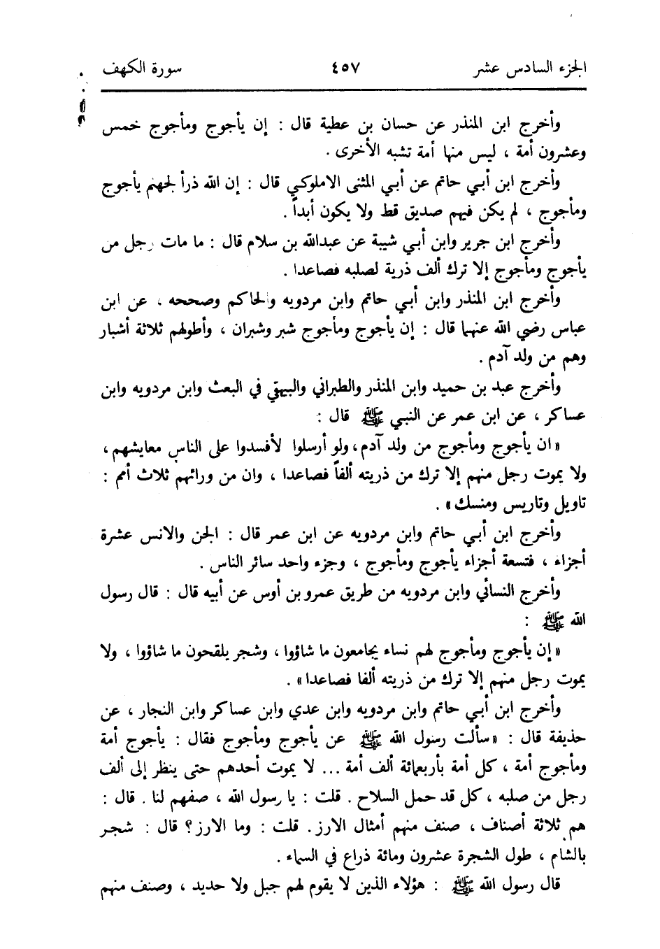 وَأخرج ابْن جرير وَابْن أبي شيبَة عَن عبد الله بن سَلام قَالَ: مَا مَاتَ رجل من يَأْجُوج وَمَأْجُوج إِلَّا ترك ألف ذُرِّيَّة لصلبه فَصَاعِدا