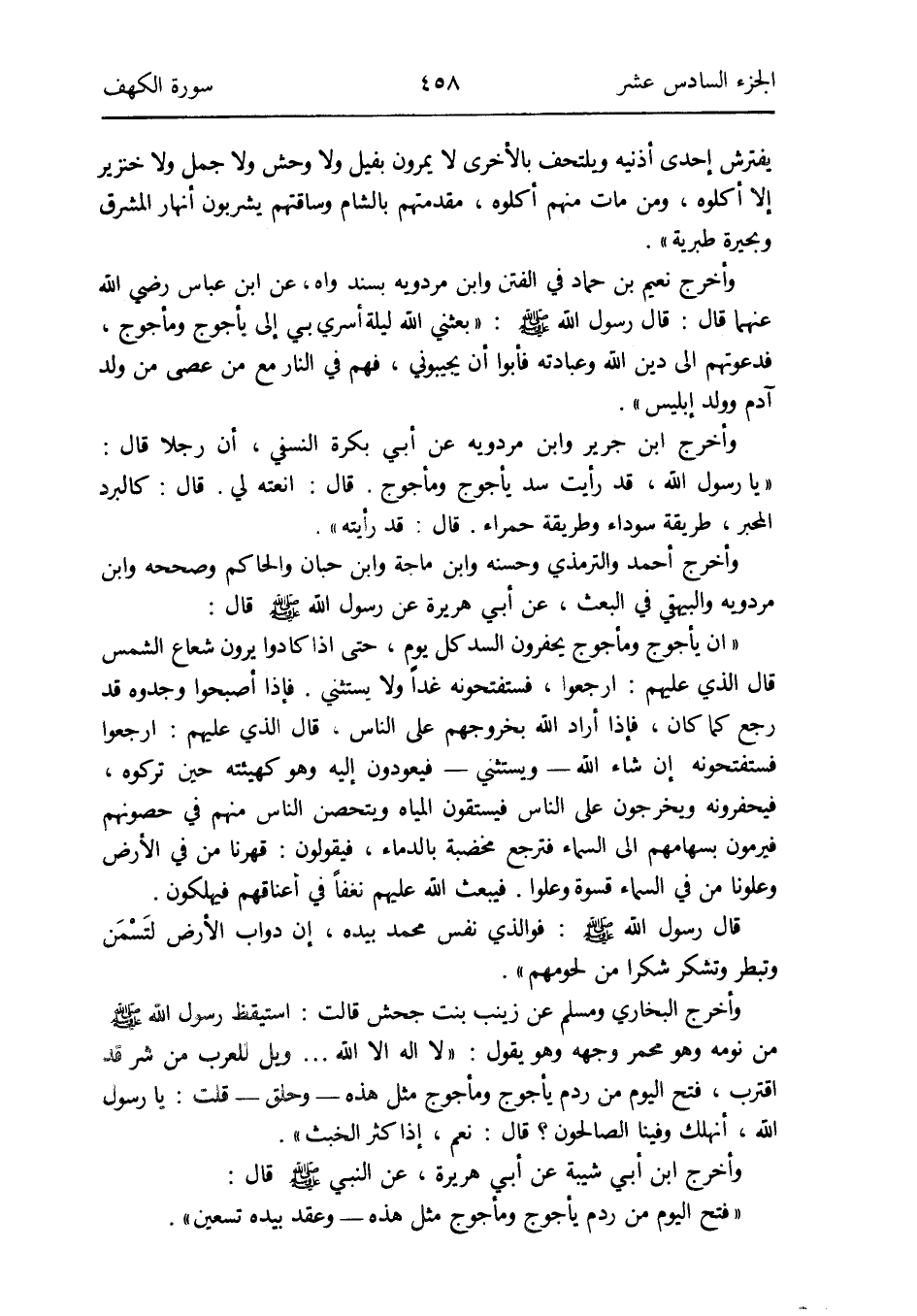 وَأخرج أَحْمد وَالتِّرْمِذِيّ وَحسنه وَابْن ماجة وَابْن حبَان وَالْحَاكِم وَصَححهُ وَابْن مرْدَوَيْه وَالْبَيْهَقِيّ فِي الْبَعْث عَن أبي هُرَيْرَة عَن رَسُول الله صلى الله عَلَيْهِ وَسلم قَالَ: إِن يَأْجُوج وَمَأْجُوج يحفرون السد كل يَوْم حَتَّى إِذا كَادُوا يرَوْنَ شُعَاع الشَّمْس قَالَ الَّذِي عَلَيْهِم: ارْجعُوا فستفتحونه غَدا وَلَا يَسْتَثْنِي