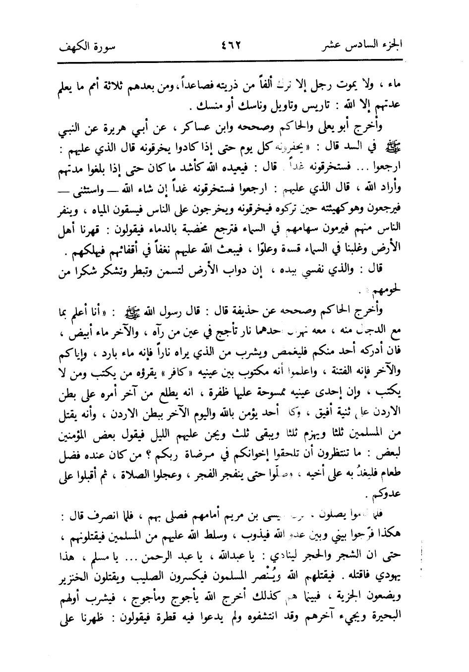 وَأخرج الْحَاكِم وصحه عَن حُذَيْفَة قَالَ: قَالَ رَسُول الله صلى الله عَلَيْهِ وَسلم: أَنا أعلم بِمَا مَعَ الدَّجَّال مِنْهُ مَعَه نهران أَحدهمَا نَار تأجج فِي عين من رَآهُ وَالْآخر مَاء أَبيض فَإِن أدْركهُ أحد مِنْكُم فليغمض وَيشْرب من الَّذِي يرَاهُ نَارا فَإِنَّهُ مَاء بَارِد وَإِيَّاكُم وَالْآخر فَإِنَّهُ الْفِتْنَة وَاعْلَمُوا أَنه مَكْتُوب بَين عَيْنَيْهِ كَافِر يَقْرَؤُهُ من يكْتب وَمن لَا يكْتب وَإِن إِحْدَى عَيْنَيْهِ ممسوحة عَلَيْهَا ظفرة إِنَّه يطلع من آخر أمره على بطن الْأُرْدُن على ثنية أفِيق وكل أحد يُؤمن بِاللَّه وَالْيَوْم الآخر بِبَطن الْأُرْدُن وَأَنه يقتل من الْمُسلمين ثلثا ويهزم ثلثا وَيبقى ثلث ويجن عَلَيْهِم اللَّيْل فَيَقُول بعض الْمُؤمنِينَ لبَعض: مَا تنتظرون أَن تلحقوا إخْوَانكُمْ فِي مرضاة ربكُم من كَانَ عِنْده فضل طَعَام فليغدُ بِهِ على أَخِيه وصلّوا حَتَّى ينفجر الْفجْر وعجلوا الصَّلَاة ثمَّ أَقبلُوا على عَدوكُمْ