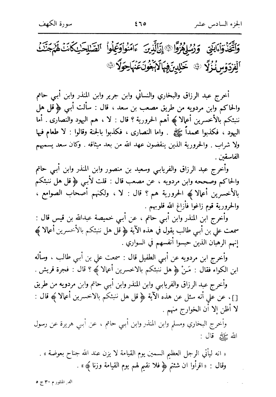 أخرج عبد الرَّزَّاق وَالْبُخَارِيّ وَالنَّسَائِيّ وَابْن جرير وَابْن الْمُنْذر وَابْن أبي حَاتِم وَالْحَاكِم وَابْن مرْدَوَيْه من طَرِيق مُصعب بن سعد قَالَ: سَأَلت أبي {قل هَل ننبئكم بالأخسرين أعمالاً} أهم الحرورية قَالَ: لَا هم الْيَهُود وَالنَّصَارَى