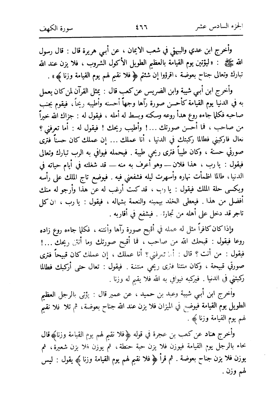وَأخرج ابْن عدي وَالْبَيْهَقِيّ فِي شعب الإِيمان عَن أبي هُرَيْرَة قَالَ: قَالَ رَسُول الله صلى الله عَلَيْهِ وَسلم: ليؤتين يَوْم الْقِيَامَة بالعظيم الطَّوِيل الأكول الشروب فَلَا يزن عِنْد الله تبَارك تَعَالَى جنَاح بعوضة اقرؤوا إِن شِئْتُم {فَلَا نُقِيم لَهُم يَوْم الْقِيَامَة وزنا}