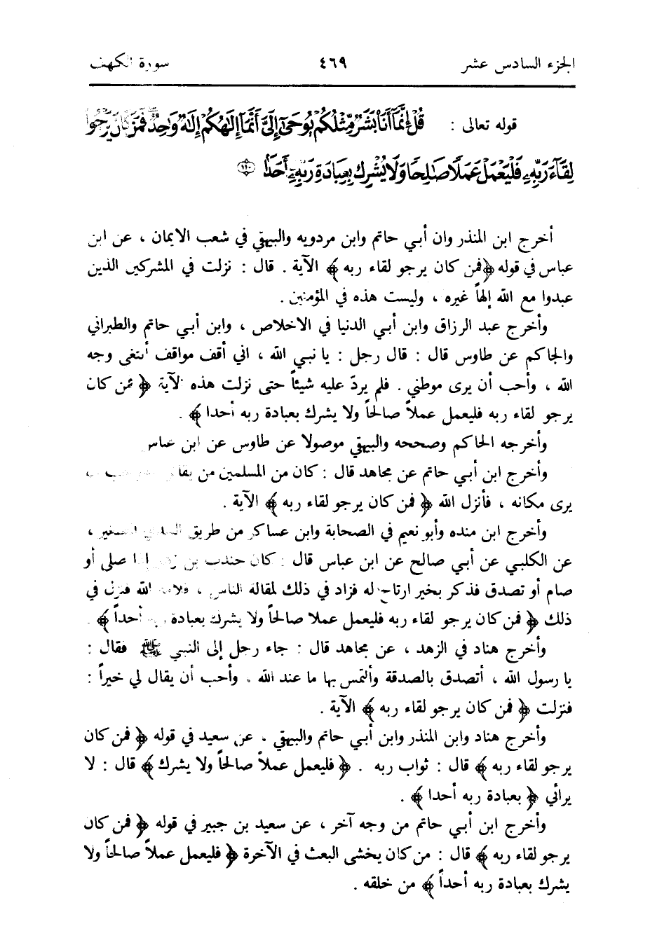 أخرج ابْن الْمُنْذر وَابْن أبي حَاتِم وَابْن مرْدَوَيْه وَالْبَيْهَقِيّ فِي شعب الإِيمان عَن ابْن عَبَّاس فِي قَوْله: {فَمن كَانَ يَرْجُو لِقَاء ربه} الْآيَة