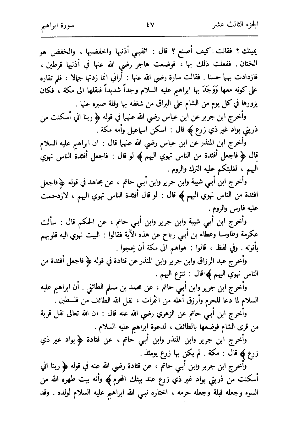 وَأخرج ابْن جرير عَن ابْن عَبَّاس رَضِي الله عَنْهُمَا فِي قَوْله: {رَبنَا إِنِّي أسكنت من ذريتي بواد غير ذِي زرع} قَالَ: اسكن إِسْمَاعِيل وَأمه مَكَّة