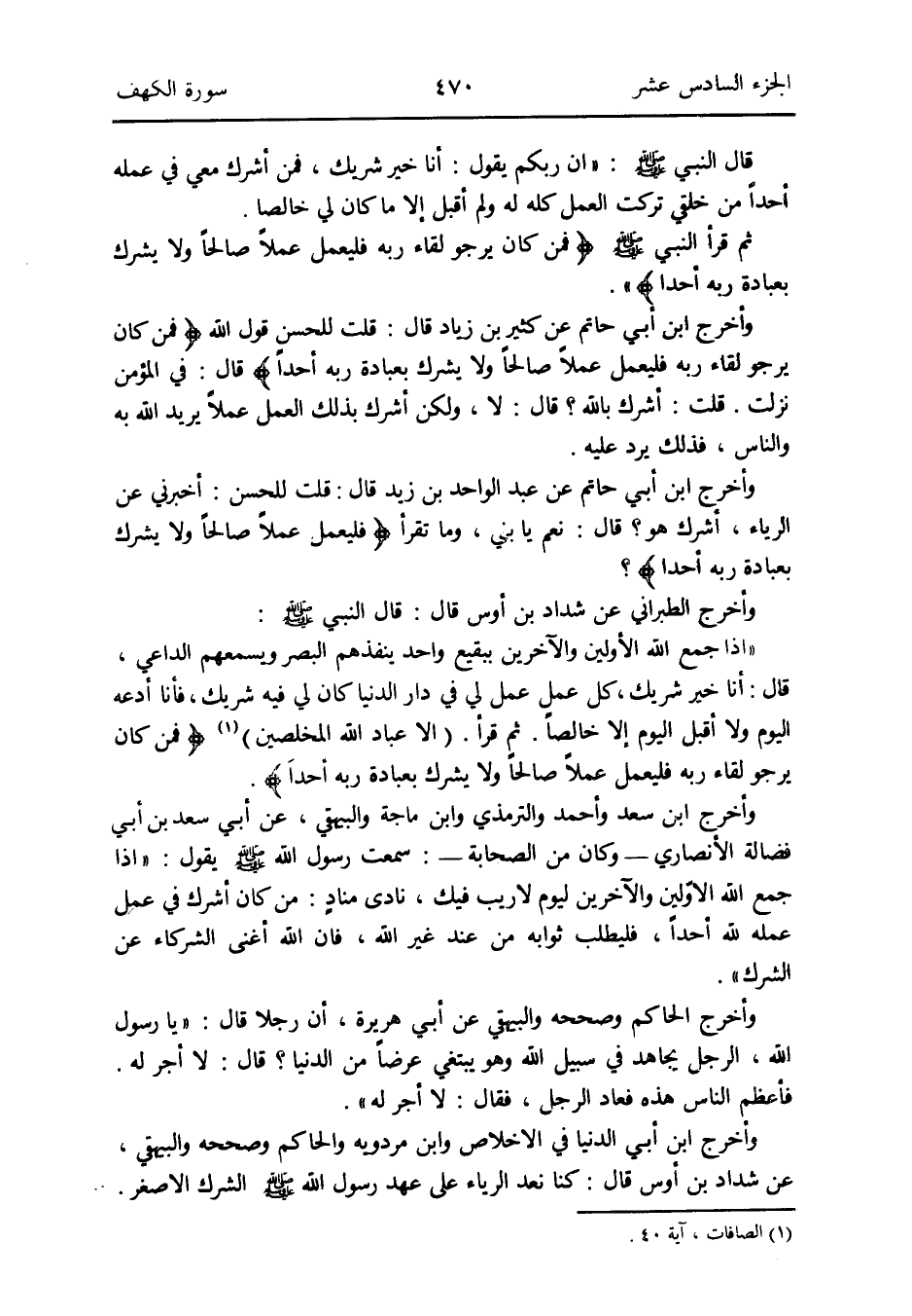 وَأخرج ابْن أبي حَاتِم عَن عبد الْوَاحِد بن زيد قَالَ: قلت لِلْحسنِ: أَخْبرنِي عَن الرِّيَاء أشرك هُوَ قَالَ: نعم يَا بني وَمَا تقْرَأ {فليعمل عملا صَالحا وَلَا يُشْرك بِعبَادة ربه أحدا} وَأخرج الطَّبَرَانِيّ عَن شَدَّاد بن أَوْس قَالَ: قَالَ النَّبِي صلى الله عَلَيْهِ وَسلم: إِذا جمع الله الْأَوَّلين والآخريين ببقيع وَاحِد ينفدهم الْبَصَر وَيسْمعهُمْ الدَّاعِي قَالَ: أَنا خير شريك كل عَمل عُمل لي فِي دَار الدُّنْيَا كَانَ لي فِيهِ شريك فَأَنا أَدَعهُ الْيَوْم وَلَا أقبل الْيَوْم إِلَّا خَالِصا