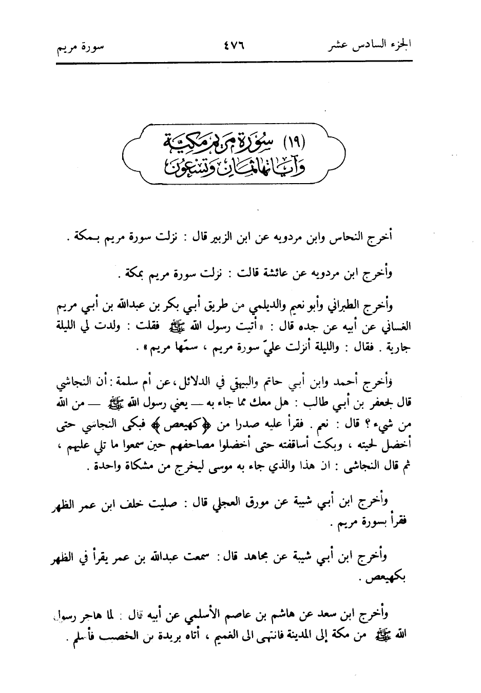 مُقَدّمَة سُورَة مَرْيَم أخرج النّحاس وَابْن مرْدَوَيْه عَن ابْن الزبير قَالَ: نزلت سُورَة مَرْيَم بِمَكَّة