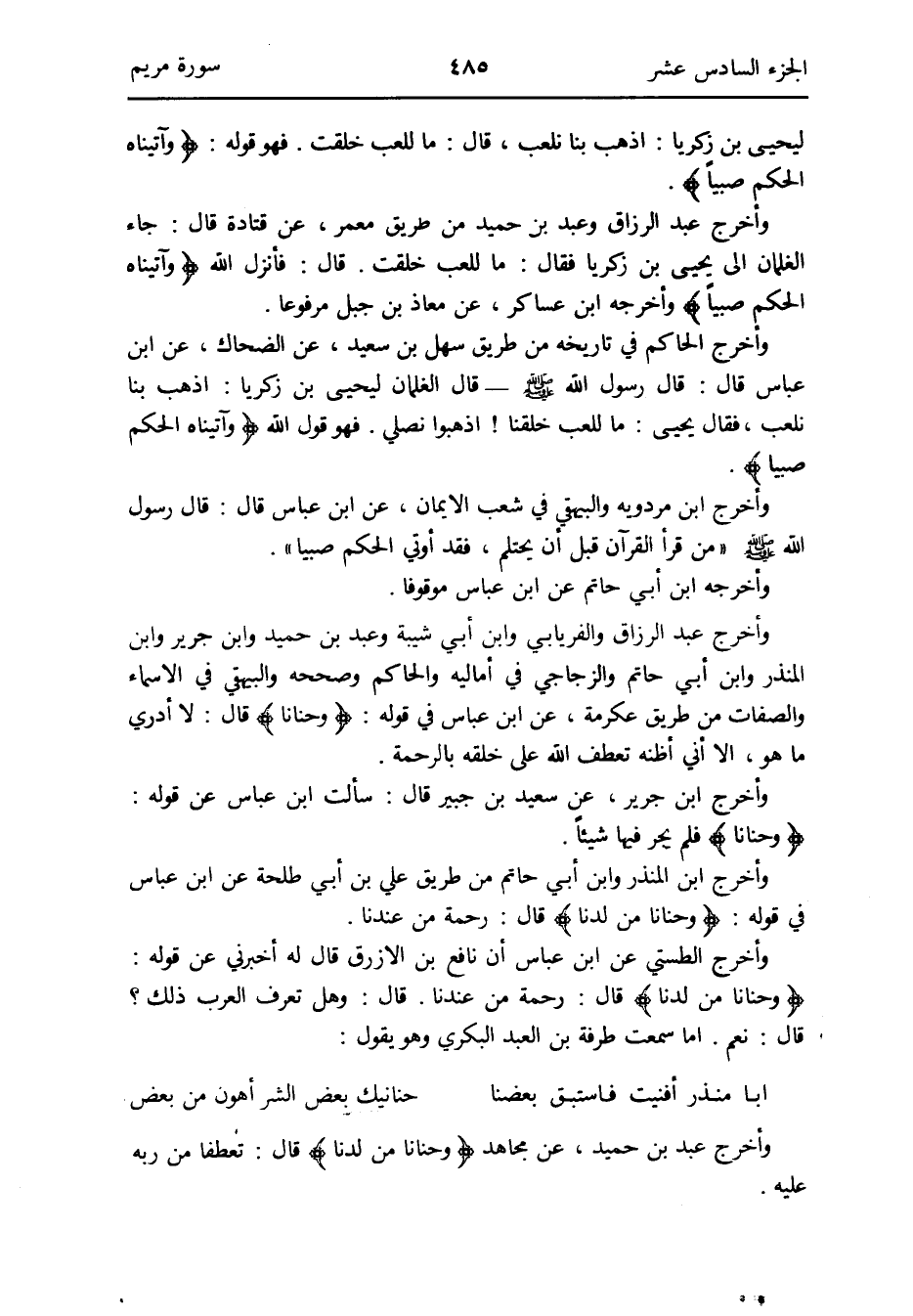 وَأخرج عبد الرَّزَّاق وَالْفِرْيَابِي وَابْن أبي شيبَة وَعبد بن حميد وَابْن جرير وَابْن الْمُنْذر وَابْن أبي حَاتِم والزجاجي فِي أَمَالِيهِ وَالْحَاكِم وَصَححهُ وَالْبَيْهَقِيّ فِي الْأَسْمَاء وَالصِّفَات من طَرِيق عِكْرِمَة عَن ابْن عَبَّاس فِي قَوْله: {وَحَنَانًا} قَالَ: لَا أَدْرِي مَا هُوَ إِلَّا أَنِّي أَظُنهُ تعطف الله على خلقه بِالرَّحْمَةِ