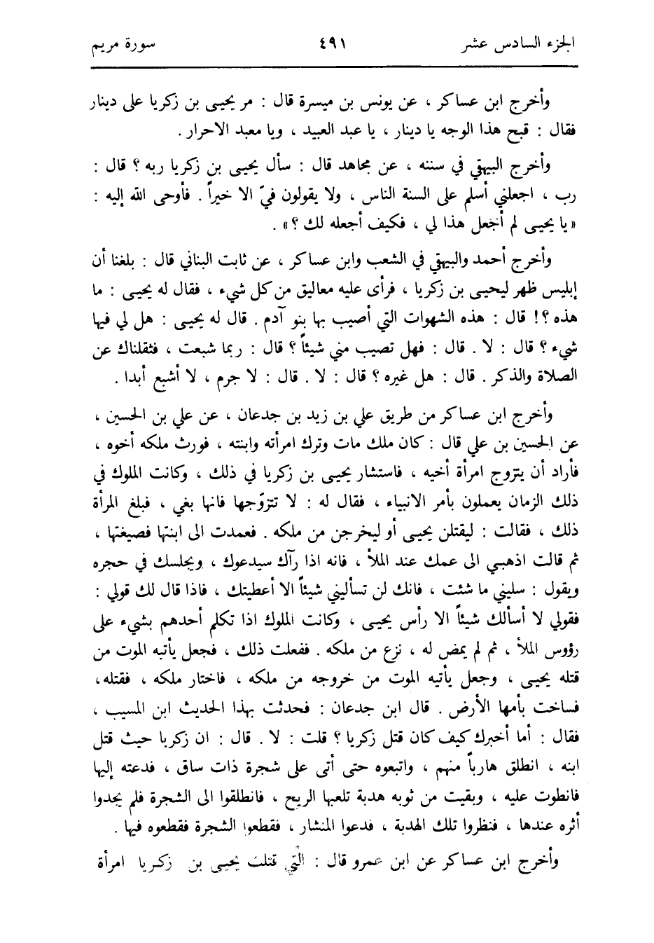 وَأخرج ابْن عَسَاكِر من طَرِيق عَليّ بن زيد بن جدعَان عَن عَليّ بن الْحُسَيْن عَن الْحُسَيْن بن عَليّ قَالَ: كَانَ ملك مَاتَ وَترك امْرَأَته وَابْنَته فورث ملكه أَخُوهُ فَأَرَادَ أَن يتَزَوَّج امْرَأَة أَخِيه فَاسْتَشَارَ يحيى بن زَكَرِيَّا فِي ذَلِك وَكَانَت الْمُلُوك فِي ذَلِك الزَّمَان يعلمُونَ بِأَمْر الْأَنْبِيَاء فَقَالَ لَهُ: لَا تتزوّجها فَإِنَّهَا بغي فَبلغ الْمَرْأَة ذَلِك فَقَالَت: ليقْتلن يحيى أَو ليخرجن من ملكه