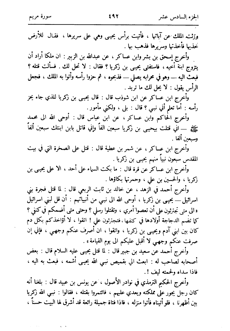 وَأخرج ابْن عَسَاكِر عَن ابْن شَوْذَب قَالَ: قَالَ يحيى بن زَكَرِيَّا للَّذي جَاءَ يحز رَأسه: أما تعلم أَنِّي نَبِي قَالَ: بلَى وَلَكِنِّي مَأْمُور